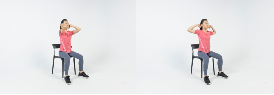 双手扶在耳后,进行肩胛骨收缩拉伸练习,双手慢慢向前,尽量靠在一起,然后慢慢打开,伸展,感受牵拉感,再重复动作,每组8次,重复2-3组。