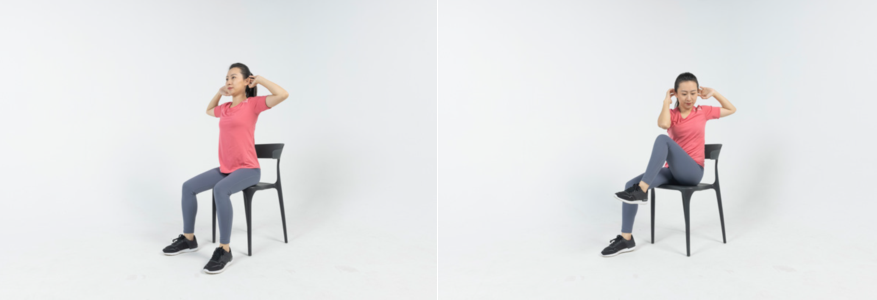 双手扶住耳后,右手尽量向左膝靠近,然后打开右手,伸直左腿,用右手去摸左脚,接着换一侧进行,每侧进行8次,两侧完成为一组,重复2-3组。