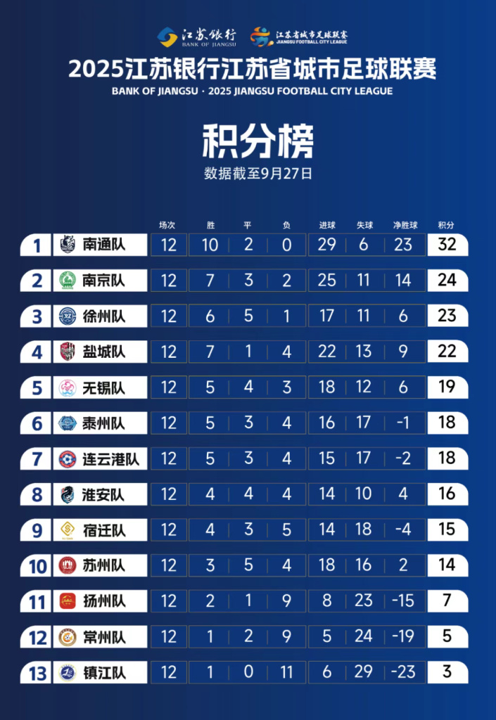 徐州队本轮被逼平,也让他们被南京队超越,最终排名第三。盐城队2:0击败扬州队后,排在第四位。另外一场比赛,苏州队主场与常州队奉献一场进球大战,最终苏州队3:2“绝杀”对手,排名第十,扬州、常州和镇江队分列11至13位。
