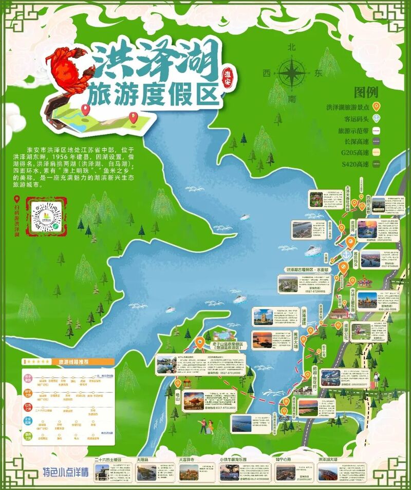 该线路全长约为20.2公里,以“湖滨休闲·文化体验·户外运动”为功能定位,包含洪泽湖碑、大湖之眼、周桥大塘、小铁牛萌宠乐、水釜城三馆、环湖骑行(专业绿道)、乘船游湖(水上观光)、湖边露营(观星与落日欣赏)、游泳(亲水运动)及慢跑等项目。