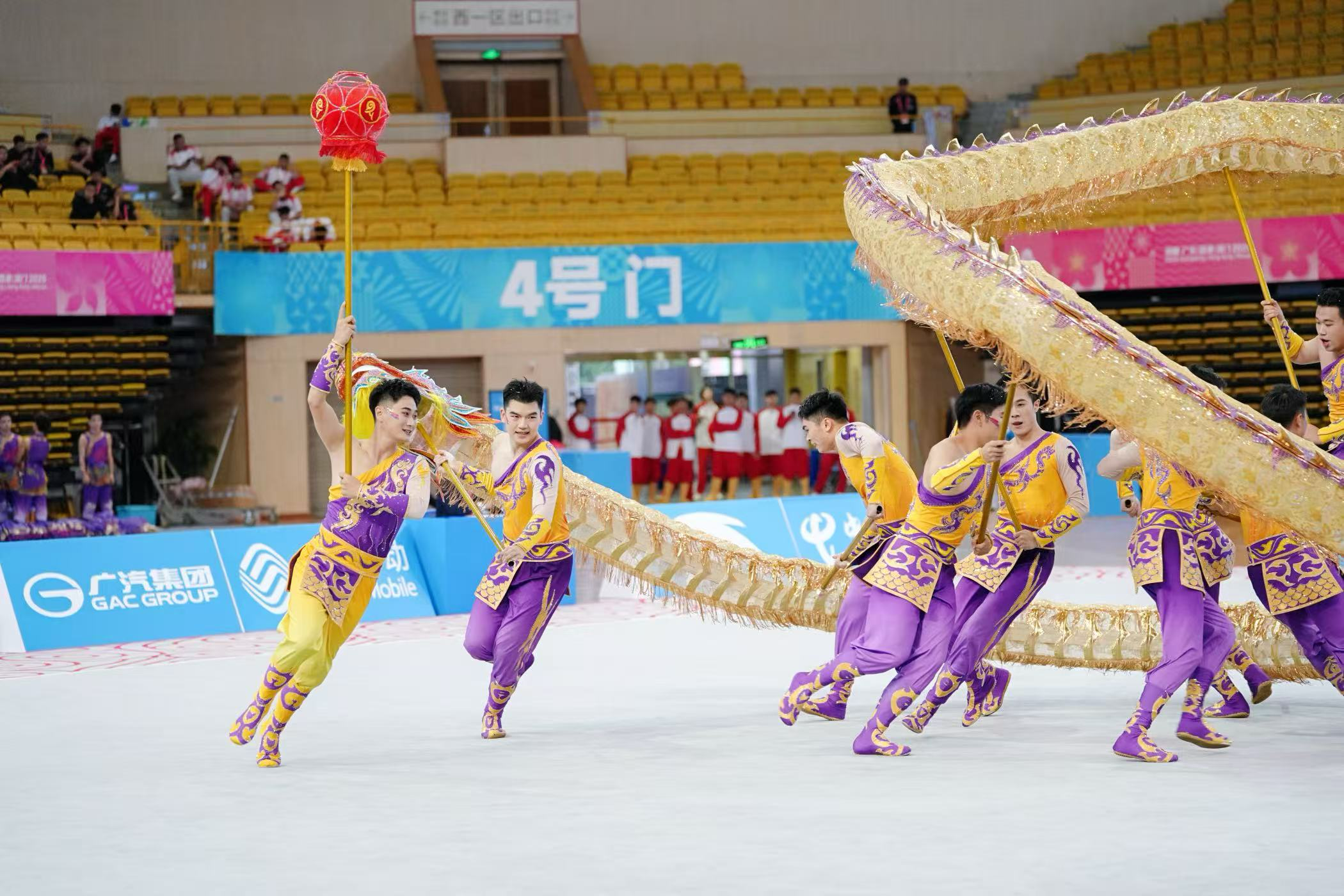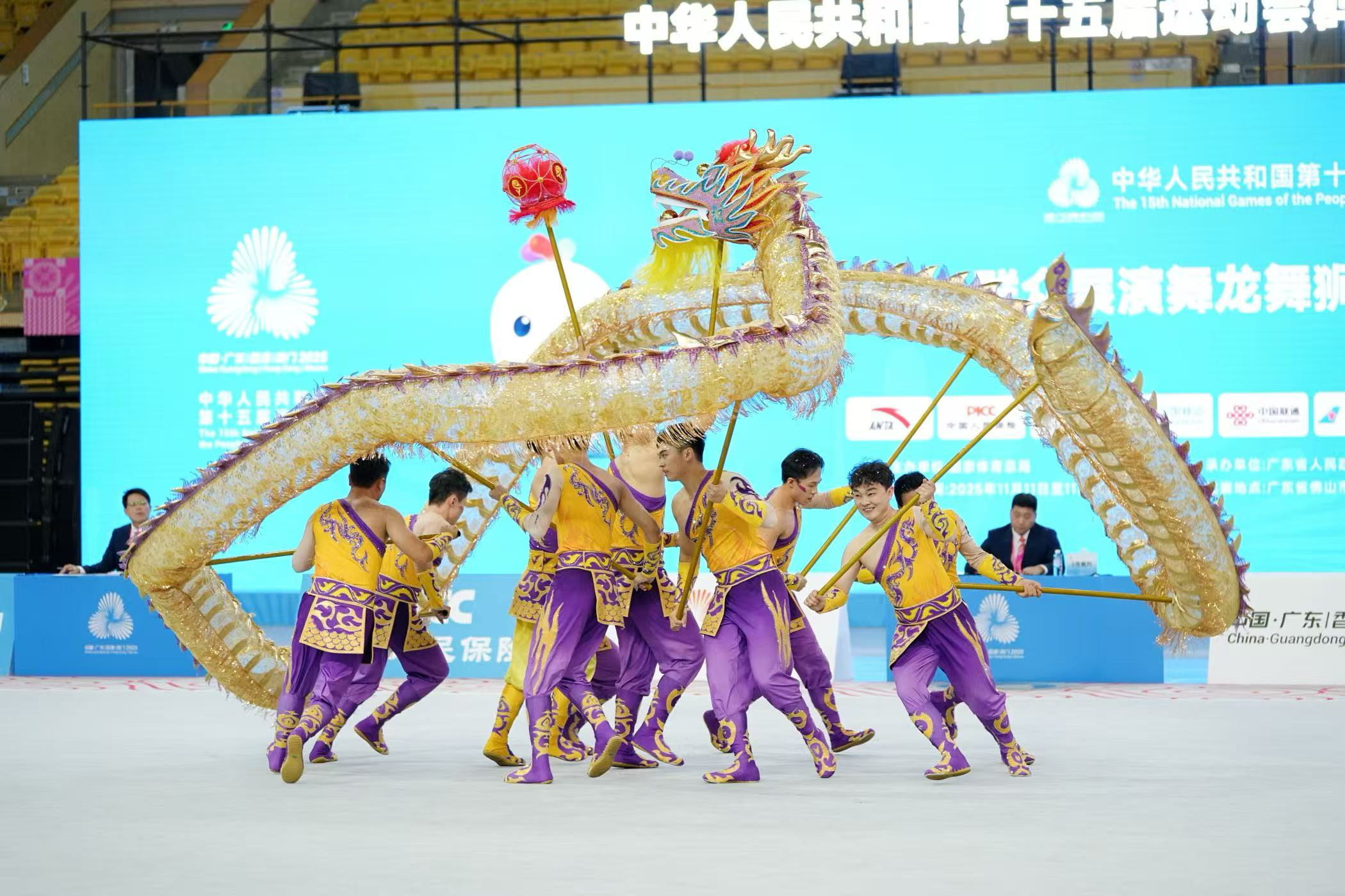 新华日报·交汇点讯 11月12日,在广东佛山岭南明珠体育馆举行的全运会群众展演舞龙舞狮项目决赛舞龙规定套路比拼中,江苏代表团凭借精湛技艺和默契配合,以9.20分的优异成绩斩获一等奖,为江苏代表团再添一枚沉甸甸的金牌。