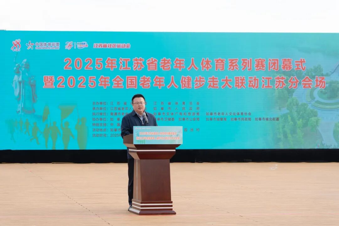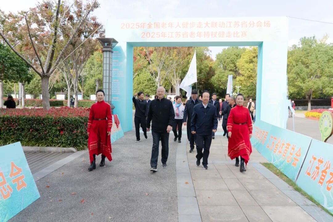 11月11日, 2025年全国老年人健步走大联动江苏省分会场暨江苏省老年人体育系列赛闭幕式在南通如皋市龙游河生态公园拉开帷幕。来自全省各地的老年体育爱好者与线上万名参与者一道,用矫健的步伐、灿烂的笑容,共同绘就了一幅“最美夕阳红”的生动画卷。
