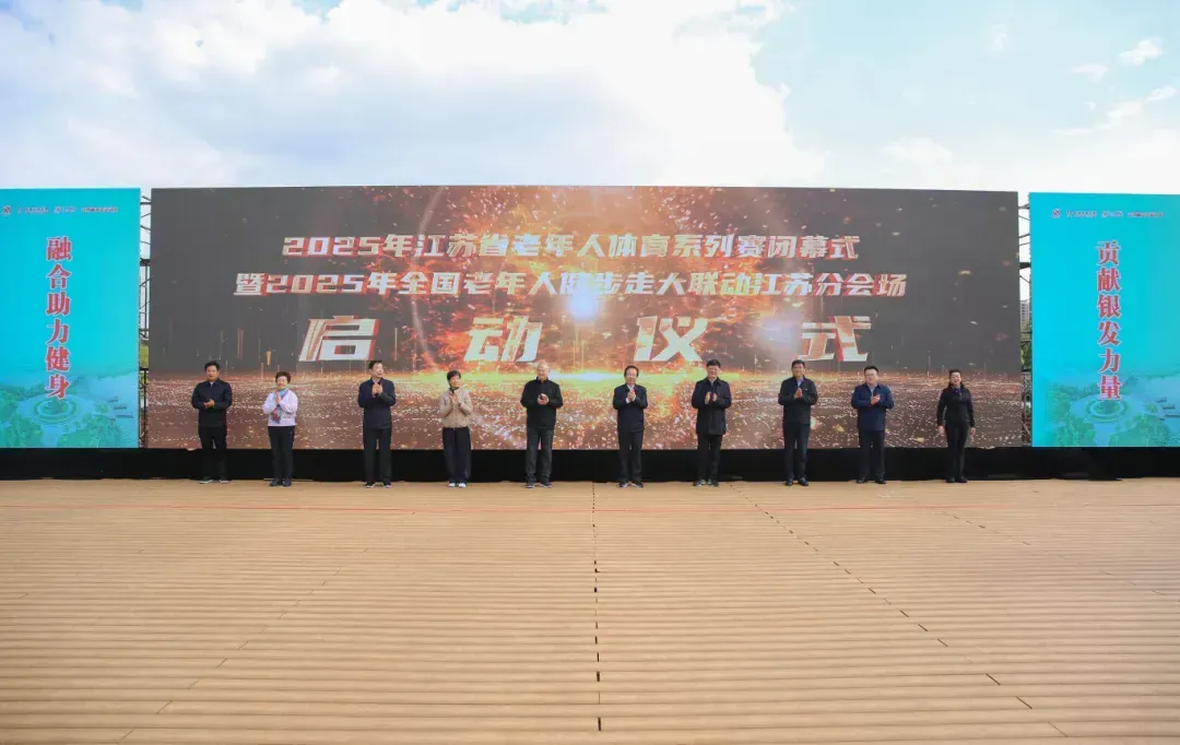 与会领导和嘉宾共同启动了 2025年全国老年人健步走大联动江苏省分会场暨江苏省老年人体育系列赛闭幕式活动。