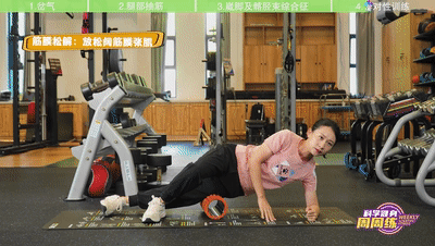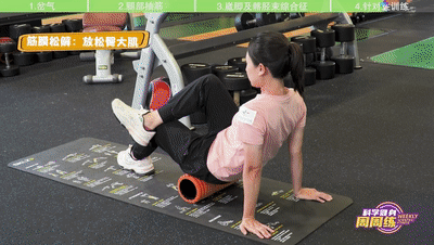 坐在泡沫轴上,双手置于身后垫子上,支撑一部分体重,在臀大肌部位前后滚动,可以通过单独滚动放松的单侧腿来加强放松强度。